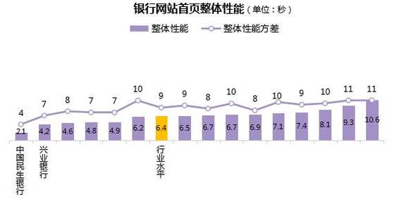 总体上,银行网站首页整体性能行业水平为6.4秒,各行中,最短为2.1秒,最长为10.6秒,有6家银行的网站首页整体性能好于行业水平。(图中折线为各行网站首页整体性能方差,方差越小,说明整体性能水平越稳定,反之则说明网站整体性能波动较大。)