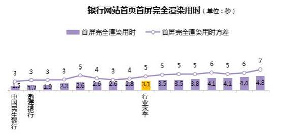 总体上,银行网站首页首屏完全渲染用时行业水平为3.1秒,各行中,最短为1.5秒,最长为4.8秒,有8家银行的网站首页首屏完全渲染用时较短,好于行业水平。(图中折线为各行网站首页首屏完全渲染用时方差,方差越小,说明各行网站首页首屏完全渲染用时差异越小。)