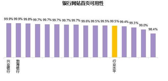 总体上,银行网站首页可用性行业水平为99.5%,各行中,最高为99.9%,最低为98.4%,有11家银行的网站首页可用性好于行业水平。