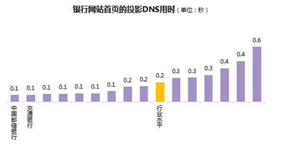 总体上,银行网站首页投影DNS用时行业水平为0.2秒,各行中,最短为0.1秒,最长为0.6秒,有9家银行的网站首页投影DNS用时好于行业水平。