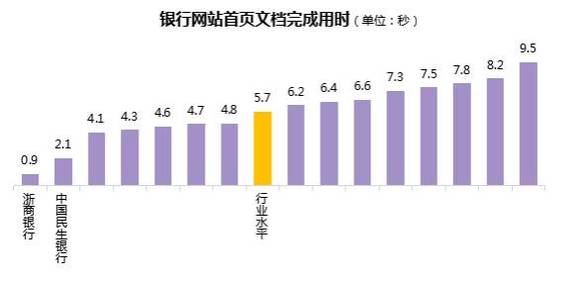 总体上,银行网站首页文档完成用时行业水平为5.7秒,各行中,最短为0.9秒,最长为9.5秒,有7家银行网站首页文档完成用时较短,好于行业水平。