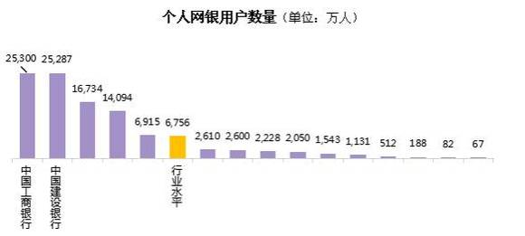 个人网上银行用户数量行业水平为6756万,各家银行中,最多的是中国工商银行,为25300万,其次是中国建设银行,为25287万。最少的为67万,有5家银行的个人网银用户数量好于行业水平。