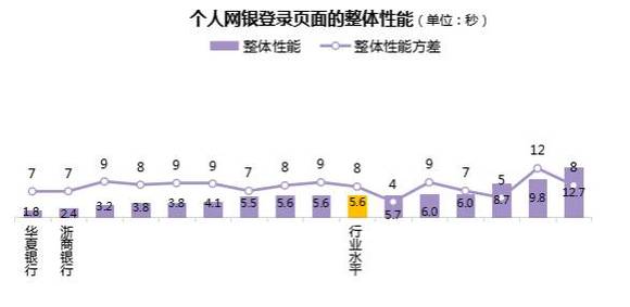 总体上,个人网银登录页面整体性能行业水平为5.6秒,各行中,最短为1.8秒,最长为12.7秒,有9家银行的个人网银登录页面整体性能好于行业水平。(图中折线为各行网银登录页面整体性能方差,方差越小,说明整体性能水平越稳定,反之则说明网银登录页面整体性能波动较大。)