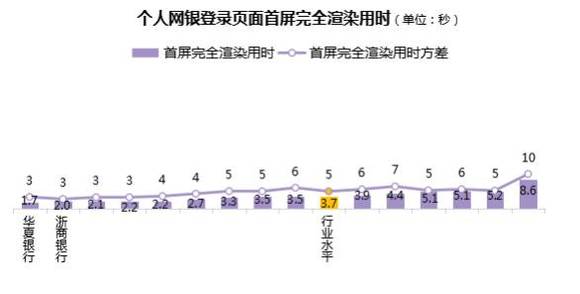 总体上,个人网银登录页面首屏完全渲染用时行业水平为3.7秒,各行中,最短为1.7秒,最长为8.6秒,有9家银行的个人网银登录页面首屏完全渲染用时较短,好于行业水平。(图中折线为各行网银登录页面首屏完全渲染用时方差,方差越小,说明各行网银登录页面首屏完全渲染用时差异越小。)