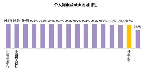 总体上,个人网银登录页面的可用性行业水平为97.5%,各行中,最高为99.6%,最低为74.7%,有14家银行的个人网银登录页面可用性好于行业水平。