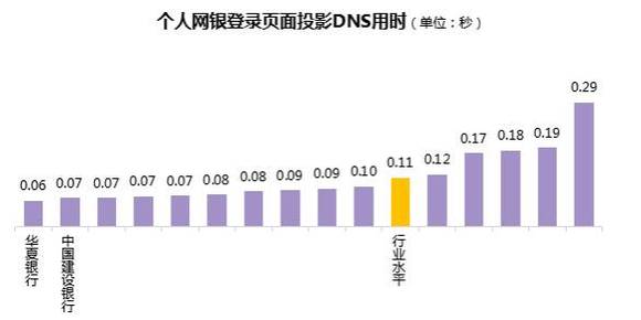 总体上,个人网银登录页面投影DNS用时行业水平为0.11秒,各行中,最短为0.06秒,最长为0.29秒,有10家银行的个人网银登录页面投影DNS用时较短,好于行业水平。