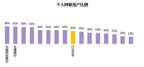 个人网上银行用户比例平均为41%,各行中最高为56%,最低为23%,有8家银行的个人网银用户比例较高,好于行业水平。