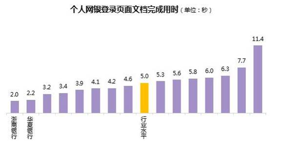 总体上,个人网银登录页面的文档完成用时行业水平为5.0秒,各行中,最短为2.0秒,最长为11.4秒,有8家银行的个人网银登录页面文档完成用时较短,好于行业水平。