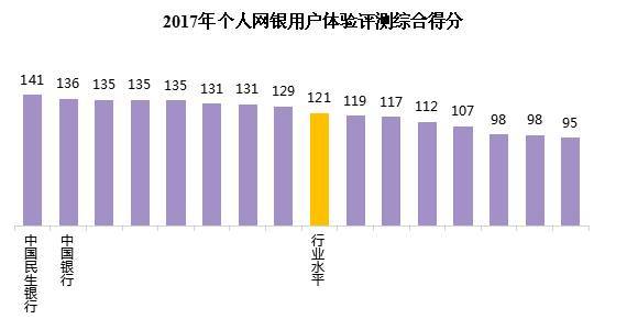 2017年个人网银用户体验评测的行业平均得分为121。各家银行中,最高分为141,最低分为95,有8家银行的得分高于行业水平。