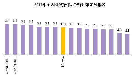 2017年个人网银用户的银行印象加分行业水平为3.01分。各家银行中,最高为3.4分,最低分为2.3分,有7家银行的银行印象加分高于行业水平。(银行印象加分为1-5分,分值越高表示银行印象加分越多,分值越少表示银行印象加分越少)
