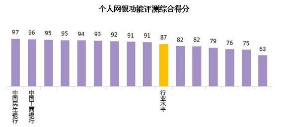 各行个人网上银行功能评测的行业平均得分为87,各家银行中,最高分为97,最低分为63,有9家银行的得分高于行业水平。