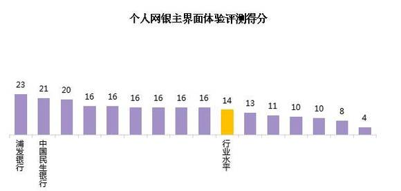 从个人网银主界面体验评测得分来看,行业平均得分为14。各家银行中,最高分为23,最低分为4,有9家银行得分高于行业水平。