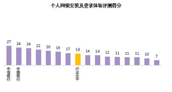 从个人网银安装及登录体验评测得分来看,行业平均得分为16。各家银行中,最高分为27,最低分为7,有7家银行得分高于行业水平。