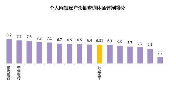 从个人网银账户余额查询体验评测得分来看,行业平均得分为6.31。各家银行中,最高分为8.2,最低分为2.2,有9家银行的得分高于行业水平。