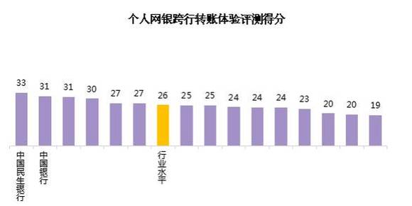 从个人网银跨行转账体验评测得分来看,行业平均得分为26。各家银行中,最高分为33,最低分为19,有6家银行的得分高于行业水平。