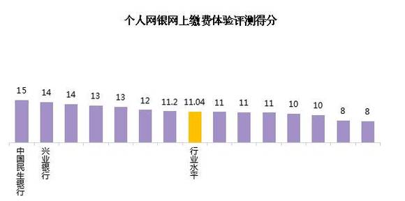 从个人网银网上缴费体验评测得分来看,行业平均得分为11.04。各家银行中,最高分为15,最低分为8,有7家银行的得分高于行业水平。(在测试的过程中,有个别银行此功能一直在维护中,无法测试或该银行不具备此功能,故此部分无数据,下图中不予展现。)