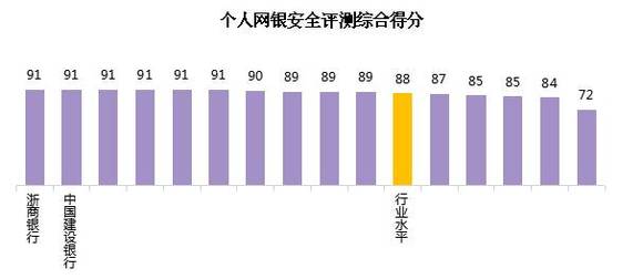 2017年个人网银安全评测的行业平均得分为88。各家银行中,最高分为91,最低分为72,有10家银行的得分高于行业水平。