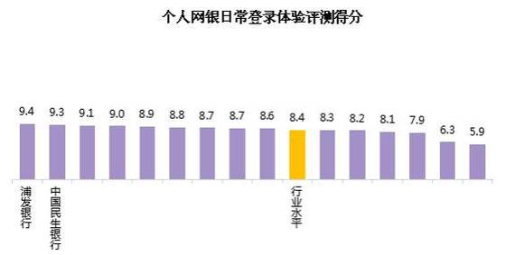 从个人网银日常登录体验评测得分来看,行业平均得分为8.4。各家银行中,最高分为9.4,最低分为5.9,有9家银行的得分高于行业水平。