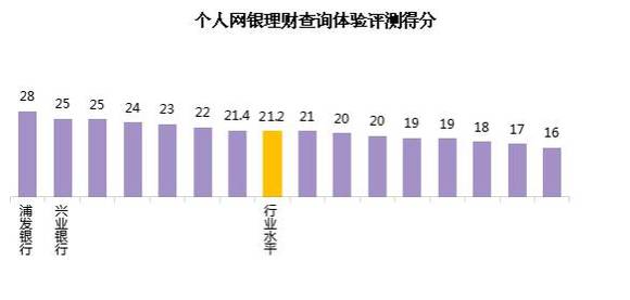 从个人网银理财查询体验评测得分来看,行业平均得分为21.2。各家银行中,最高分为28,最低分为16,有7家银行的得分高于行业水平。
