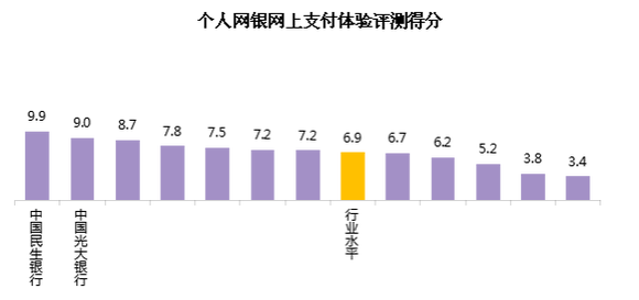 从网上支付体验评测得分来看,行业平均得分为6.9。各家银行中,最高分为9.9,最低分为3.4,有7家银行的得分高于行业水平。(在测试的过程中,有个别银行此功能一直在维护中,无法测试或该银行不具备此功能,故此部分无数据,下图中不予展现。)
