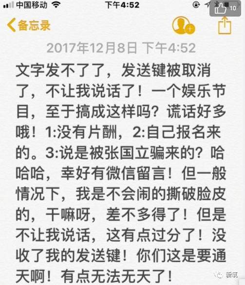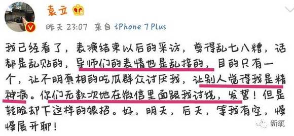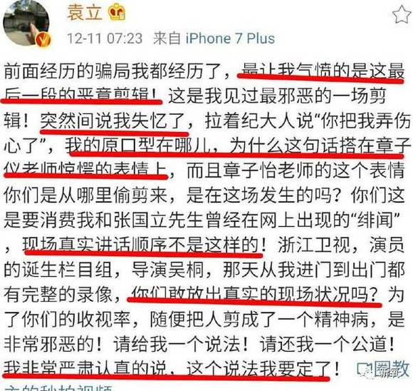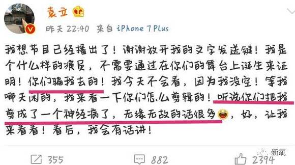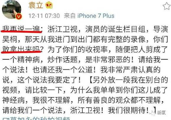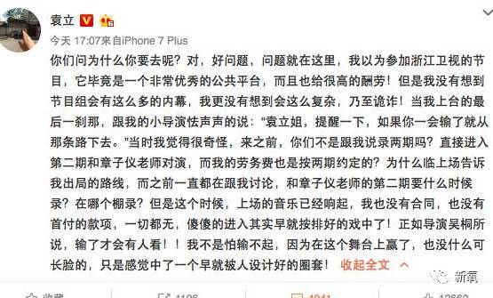可是不知道什么原因,12月8号,也就是开播前一天,袁立的微博突然发不了文字,发送键也被取消了。可能因为这个事儿,激怒了袁立,所以在只能发图片的情况下,爆料了一些节目组幕后黑幕。