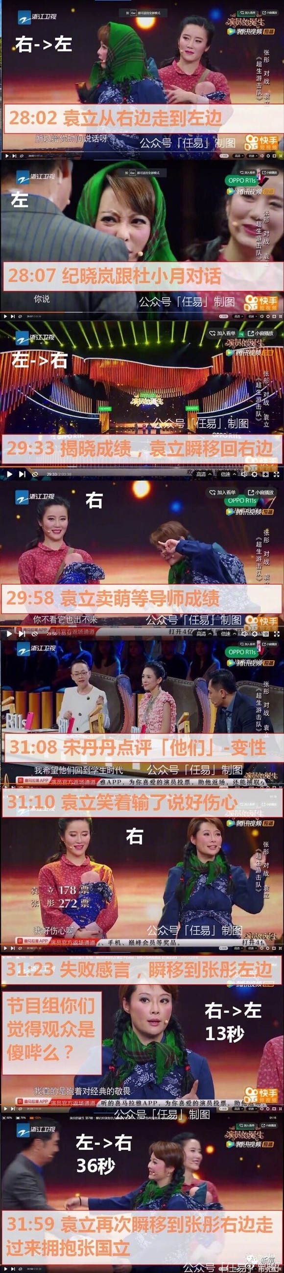 对此,有牛叉的网友还拼出了剪辑漏洞,按照时间从前到后,袁立一直和张彤左右换位,我估计只有多动症才会这么做吧?