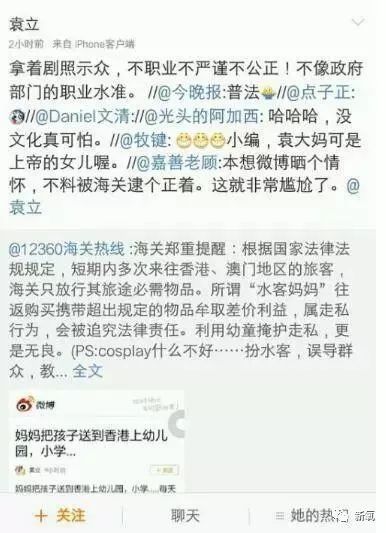还曾在微博上写过自己的电影中关于“水客”妈妈和“跨境儿童”的故事,因为“水客”妈妈的一些行为可能会涉嫌到“走私”的环节,所以海关利用袁立的微博发表警示。