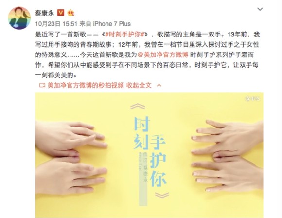 我们这次推出的时刻手护护手霜,针对消费者在六大场景的不同的护手需求、都有相应的解决方案。所以我们除了那些大家都知道的时尚护肤达人之外,我们还根据不同产品的应用场景,找到了这个场景下“典型用户”的KOL。譬如演员马可,他作为演员片场拍戏是非常辛苦的,却也是一个以美手著称的明星,让他来围绕户外挑战和美手的关系来阐述我们的产品理念,粉丝的反应就非常好,踊跃的表示买单。譬如说家务场景,家务场景最典型的就是做饭、洗菜洗碗,那我们就找到了美食达人密子君。因为爱美食的人通常也爱下厨,在下厨做家务饱口福的同时,怎么让自己手部也美美的?美加净的护手霜产品就可以针对性的解决这个问题。还有像落落是一个作家,作为“键盘手”,也会真实产生保湿又清爽不粘腻的护手需求。