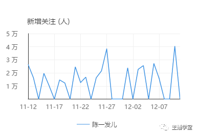 再看一下,11月27日,斗鱼鱼乐盛典全站争霸赛结束之后,发姐的直播人气和新增关注数并没有随着热度的暂时告落而有所下滑,反而保持强劲的上升趋势。