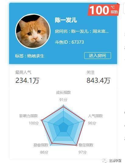从陈一发的雷达图中可见,各指数都维持着均分95分以上的超高水准。而维持100℃指数的主播只占全部主播的1%。