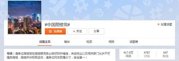而爬楼党身上还有一个重要的共同点,同时也是驱使他们去不断进行这一危险活动的因素,那就是社交媒体上的曝光。前文已经有所阐述,在社交媒体上PO出高空中的风景会收获粉丝关注度和点击量,这同样会为博主带来成就感,同时还会让他拥有一定的知名度。不过,还是有不少的爱好者更加看重Rooftopping过程中的感受,他们仅仅将这看作是爱好,而并不在意外界的看法。