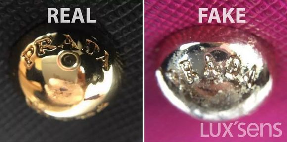 真正的Prada底脚螺柱雕刻精准、干净,并且使用相同的字体。底角螺柱上雕刻使用了错误的字体,很明显就是假的了 。