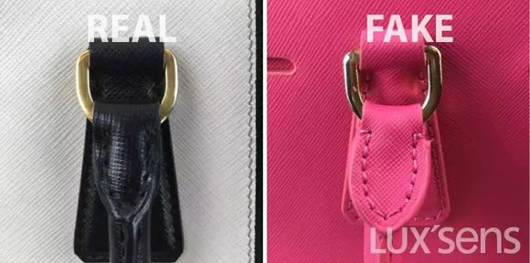 而假的Prada金属拉链头较轻,金属的水波纹比较严重。