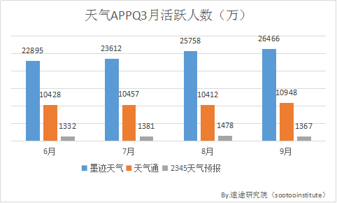 通过对三款天气APP四个月份的活跃人数跟踪数据可以看出,天气APP的月活跃人数上下起伏不大。其中墨迹天气的月活跃人数最高,四个月均有超过2亿以上的活跃人数,并且活跃人数在这个季度中逐月增加,每个月均上涨千万以上;天气通在这个季度中最稳定,最低只有几十万的人数起伏,在九月份天气通迎来了一次比较大的月活跃人数的增长,增加了500多万的月活跃人数;2345天气预报略显挣扎,由于用户基数比较小,月活跃人数无明显增加的表现,在九月份甚至比八月份低了百万人次。
