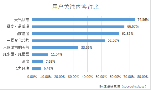在用户关注内容的调查中,七成用户最关注天气状态。天气APP的核心功能就是查看天气状态,这也是用户的基本需求;66.7%的受访者最关注最高温和最低温数据,其中,在昼夜温差较大的北方地区这一现象更为明显;而有远行或旅游计划的用户通常会关注一周天气变化走势,依靠走势来制定外出计划,避开极端天气,做出预判性的决策;只有少数用户会关注降水量、降雪量、湿度和风力风速等内容,这类数据对于大部分人群来说缺乏实质影响,用户只需要知道是否下雨和是否有大风就可以满足基本的出行计划制定的需要。