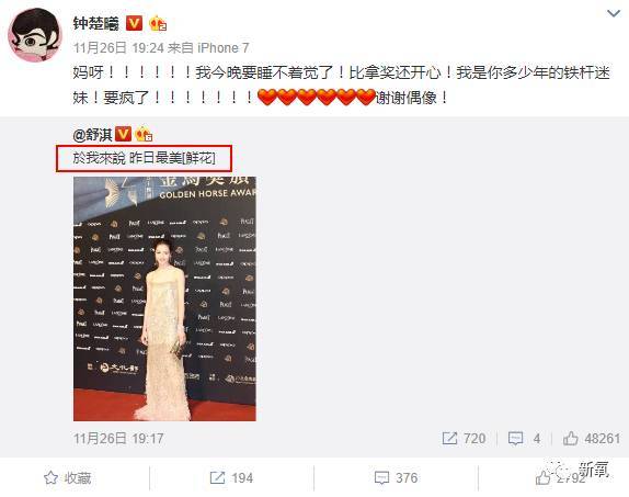 在第 54 届金马奖红毯上,钟楚曦就被自己的女神舒淇翻牌了,特意发了微博称她为昨日最美。