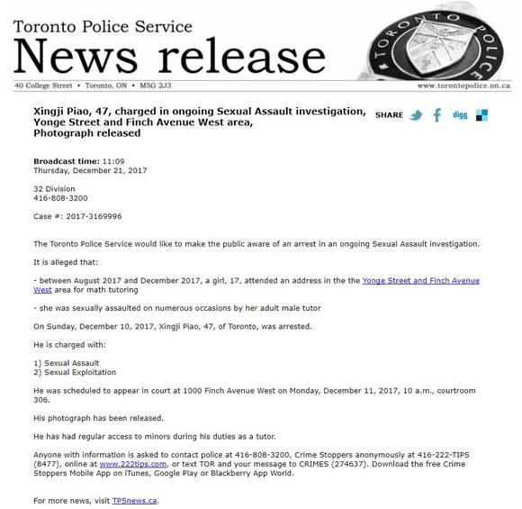 12月10日,警方逮捕了这名47岁数学老师,即多伦多居民朴星吉(Xingji Piao,音译)。警方控告他一项性侵和一项性剥削罪名。12月11日上午10点,朴星吉在安大略省法院出庭。