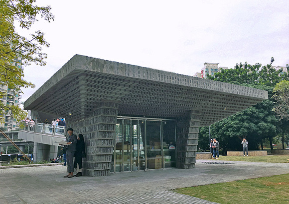 这个状如伞盖的建筑采用砖与混凝土作为主要建筑材料,在张永和看来,砖是一个具有最少时代性地域特性的材料,混凝土则是如今使用最广泛的材料,两者结合,以筋砖组成的屋面做为模板,然后与钢筋混凝土共同浇筑。“我们把砖材料做了一个它不想做的挑空空间。”亭子内部有四面不锈钢柜台供工作人员使用,向游客提供咨询服务和指引,亭子外的檐下空间丰富,与周边的绿地结合,形成开放的休憩空间。