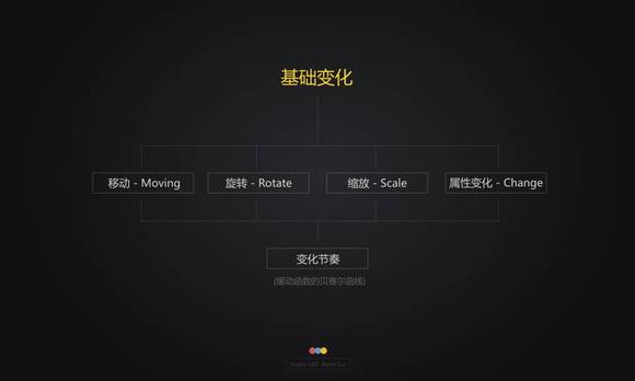 基础变化主要包含:移动,旋转,缩放以及属性变化。前面几点都很好理解,在此就不在详细解释。解释一下最后一个属性变化,它其实就是指透明度,形状,颜色等这些属性的变化。