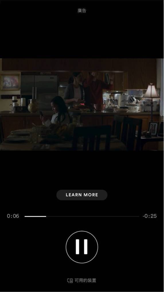 Spotify的广告形式足够令人抓狂。它并非如国内音乐APP般植入在banner、专辑封面上,而是以30秒视频广告的方式出现在歌与歌之间……广告界面还贴心地配备暂停键,用户不用担心错过任何广告的精彩瞬间。