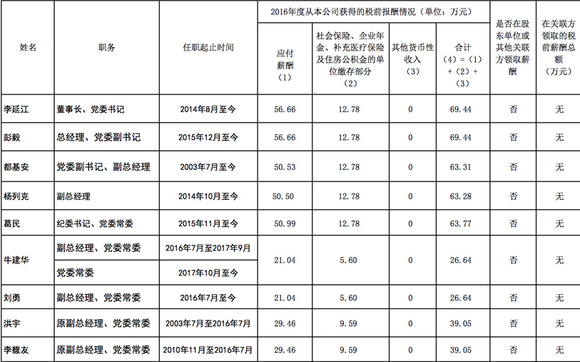 其中,神华集团董事长张玉卓2016年税前报酬为84.51万元,总经理凌文为83.13万元。中煤集团董事长李延江2016年领取的税前报酬为69.44万元,总经理彭毅为69.44万元。