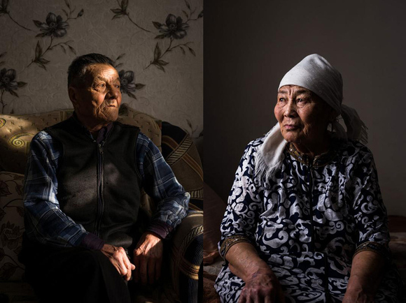 左:扎克斯伊克·阿比舒伊(Zhaksilyik Abishulyi),72岁,坐在萨瑞扎村(Saryzhal)自己家里。“我是在这土生土长的,”他说,“1949年核试验开始的时候,我还只有5岁。”