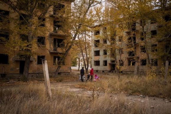 一家人路过库尔恰托夫市镇上的废弃住宅区。自核试验结束以来,镇上人口已经锐减过半。