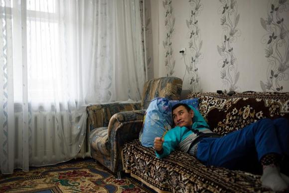 凯拉特·叶辛哈诺夫(Kairat Yesimhanov),35岁,坐在哈萨克斯坦东部索尔宾斯克市(Sulbinsk)的家里。凯拉特和妹妹艾高(Aygul)均罹患脑瘫。