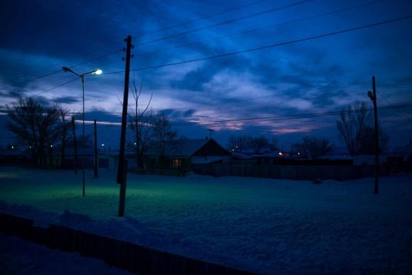 萨瑞扎的黄昏来临,这是个位于塞米巴拉金斯克试验场边缘的村庄。在冷战时期,科学家们会来到村庄检测放射性等级。村民们还记得,很多动物在核试验之后纷纷脱了毛。