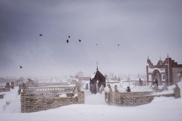 暴风雪中飞过塞米伊市郊区墓地的鸟儿。