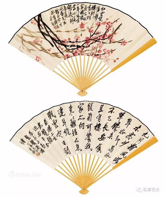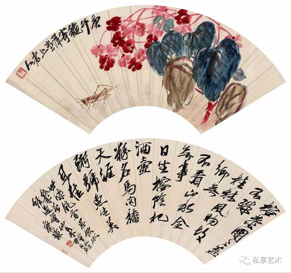扇面题识: 九月霜风落木寒,少年忘却葛衣单。饥来不乞长安食,且有楼头菊可餐。我家亦向东蓠种,太息连年绕战云。今日到君楼上坐,老馋强迫要平分。为方子易题餐菊楼诗。心畬先生正,齐璜。