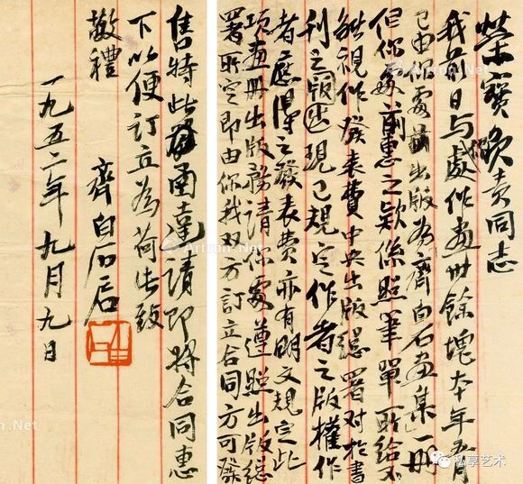 释文:荣宝斋负责同志:我前日与你处作画卅余块,本年五月已由你处出版,为《齐白石画集》一册。但你处前惠之款,系照笔单所给,不能视作发表费。中央出版总署对于书刊之出版,现已规定作者之版权,作者应得之发表费亦有明文规定。此项画册出版,务请你处遵照出版总署所定,即由你我双方订立合同,方可发售。特此函违,请即将合同惠下,以便订立为荷。此致敬礼齐白石启一九五二年九月九日。