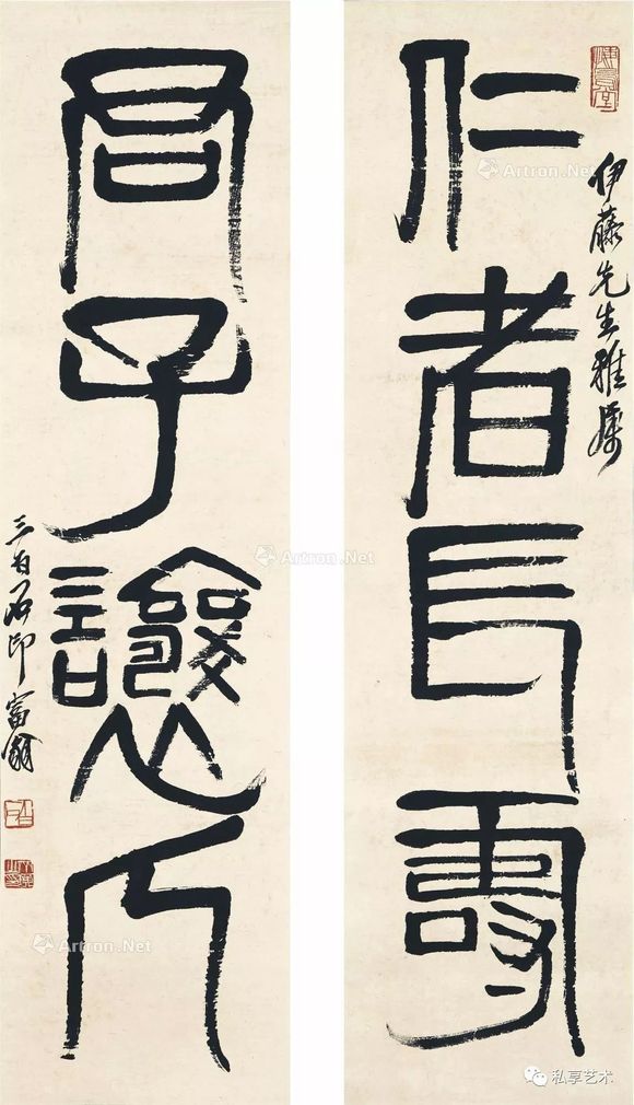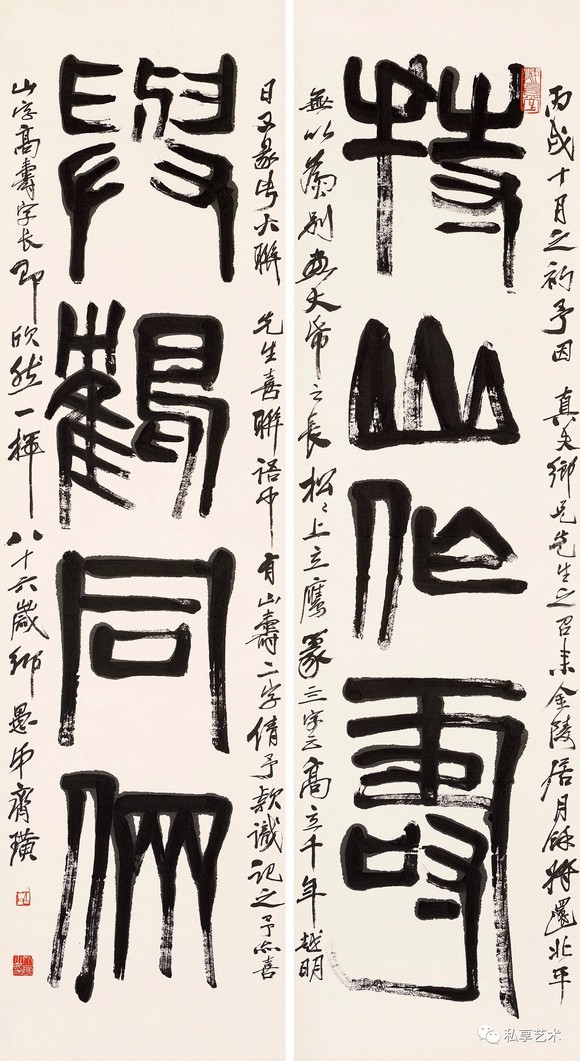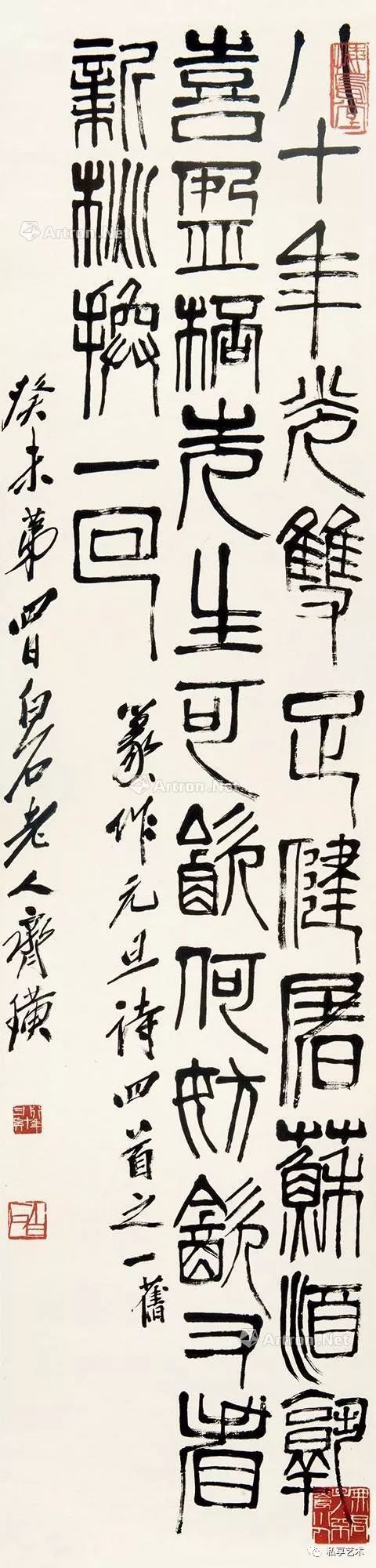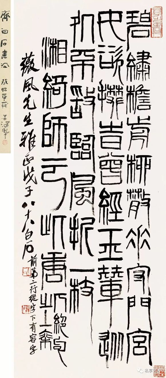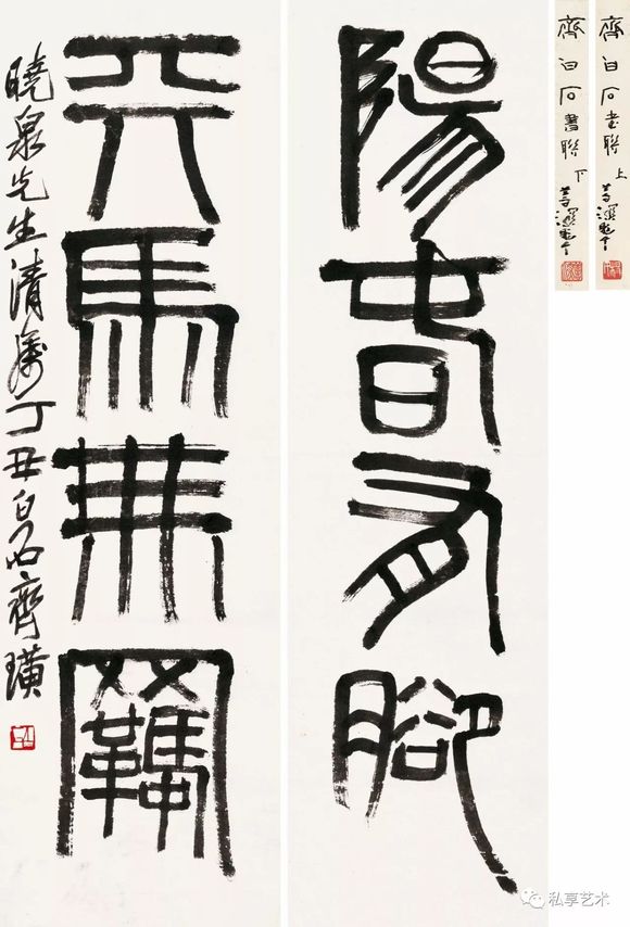 他的篆书主要取法于印章和东汉、魏晋南北朝之际兼有篆隶结体与韵味的碑版。齐白石中年时曾认真用朱笔勾临赵之谦的《二金蝶堂印谱》,为了学习治印,也是由此入门识别篆字。他的篆书多用于以擘窠大字写楹联、中堂、横披。他的篆书字体不是规范的小篆,也未上溯到金文甲骨,而是在篆隶相间中抒发豪迈、放逸、自由创造的精神意趣。