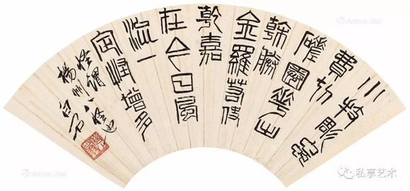 扇面题识:榕叶团团盖不殊,桂林风物故乡无。不看山水全无事,日坐榕荫把酒壶。粉名马肉播天涯,粥号鱼生美且佳。世味饱尝思饮水,几曾经过会仙来。粉店名,齐璜。印文:阿芝